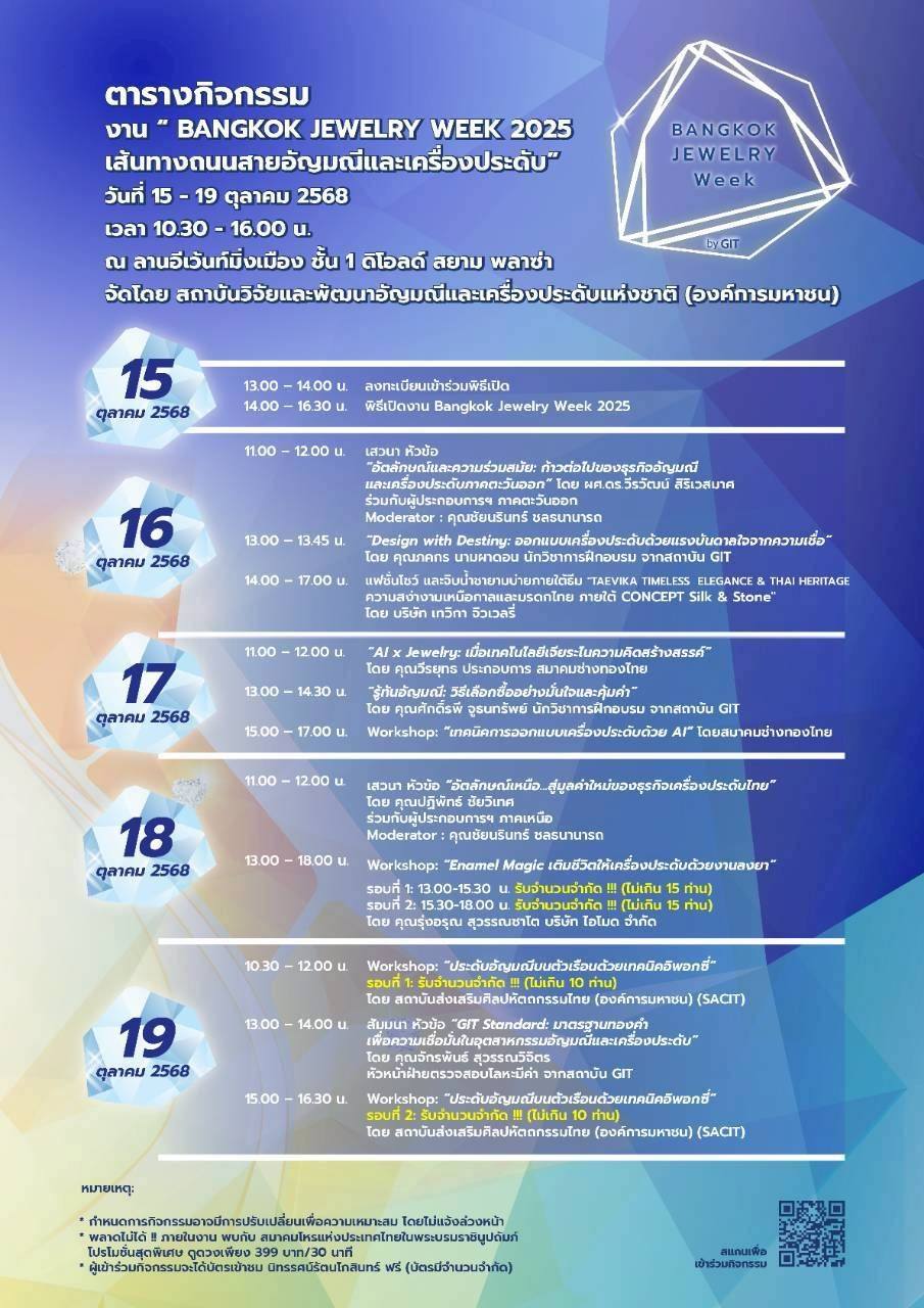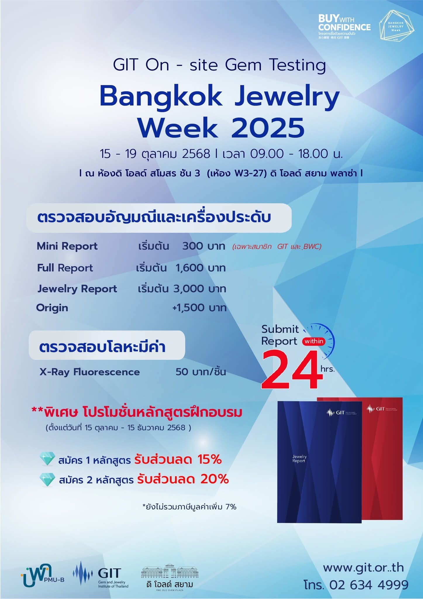 GIT จัด Bangkok Jewelry Week 2025” ต่อเนื่องปีที่ 2 โชว์ศักยภาพอัญมณีและเครื่องประดับไทยสู่เวทีโลก สถาบันวิจัยและพัฒนาอัญมณีและเครื่องประดับแห่งชาติ (องค์การมหาชน) หรือ GIT จัดงาน “Bangkok Jewelry Week 2025 เส้นทางถนนสายอัญมณีและเครื่องประดับ” ระหว่างวันที่ 15 – 19 ตุลาคม 2568 ณ ลานอีเวนท์มิ่งเมือง ชั้น 1 ดิ โอลด์ สยาม พลาซ่า